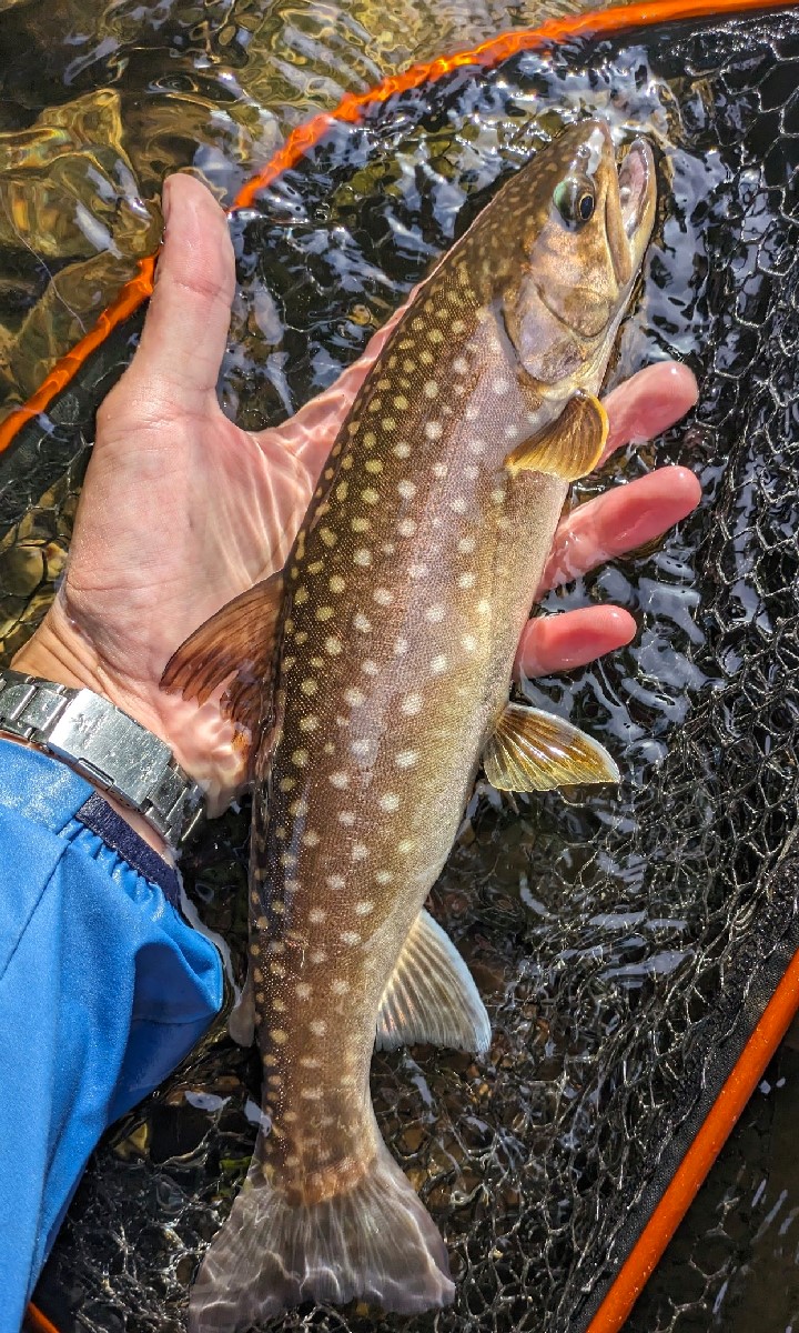 37センチのイワナがヒット。精悍な面構えといい、アイシャドウを塗ったような目の緑色といい、ここ数年見たイワナの中で一番美しいですね。しかも過去にワッカタサップ川で釣れた魚では最大サイズです。