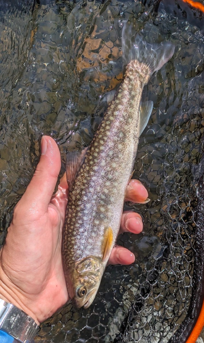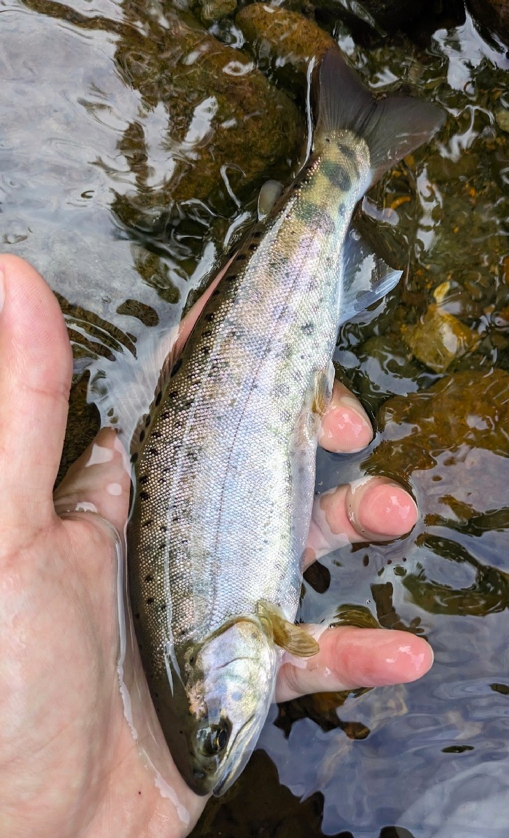22センチのヤマメがヒット。魚種の比率はヤマメとイワナが半々くらいの印象です。