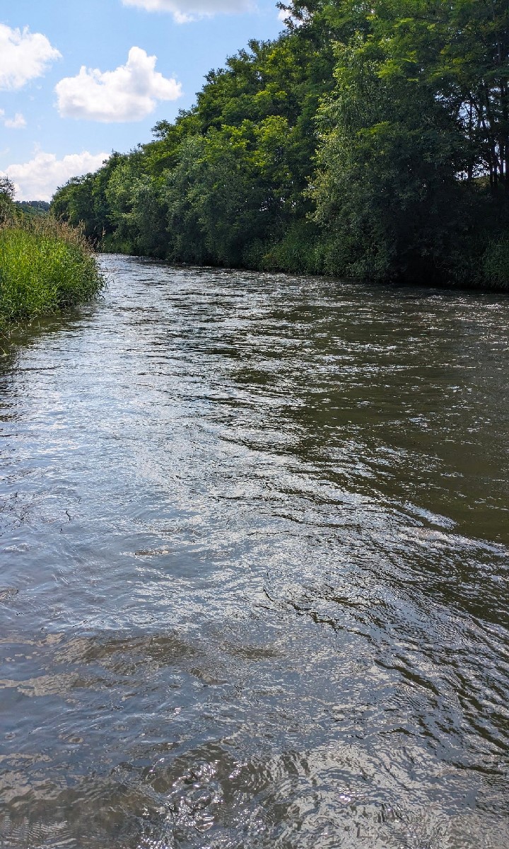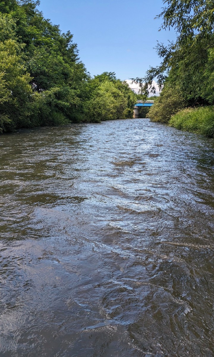 早めに見切ってさらに下流を見てみると、直線的な速い流れが続いており、ポイントが少なく遡行も大変です。それでも若干流れが緩い川岸を狙うと、