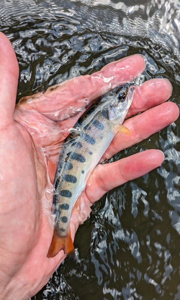 そのまま良型を探して粘ると、直線的ながら流れに変化があるポイントを発見。ここがラストチャンスと思って仕掛けを投入すると、何やらヤマメっぽくない鋭いアタリが。上がってきたのは
