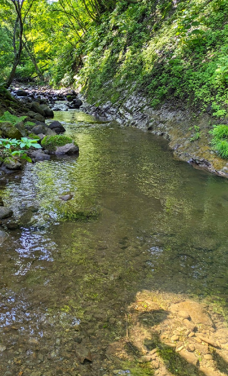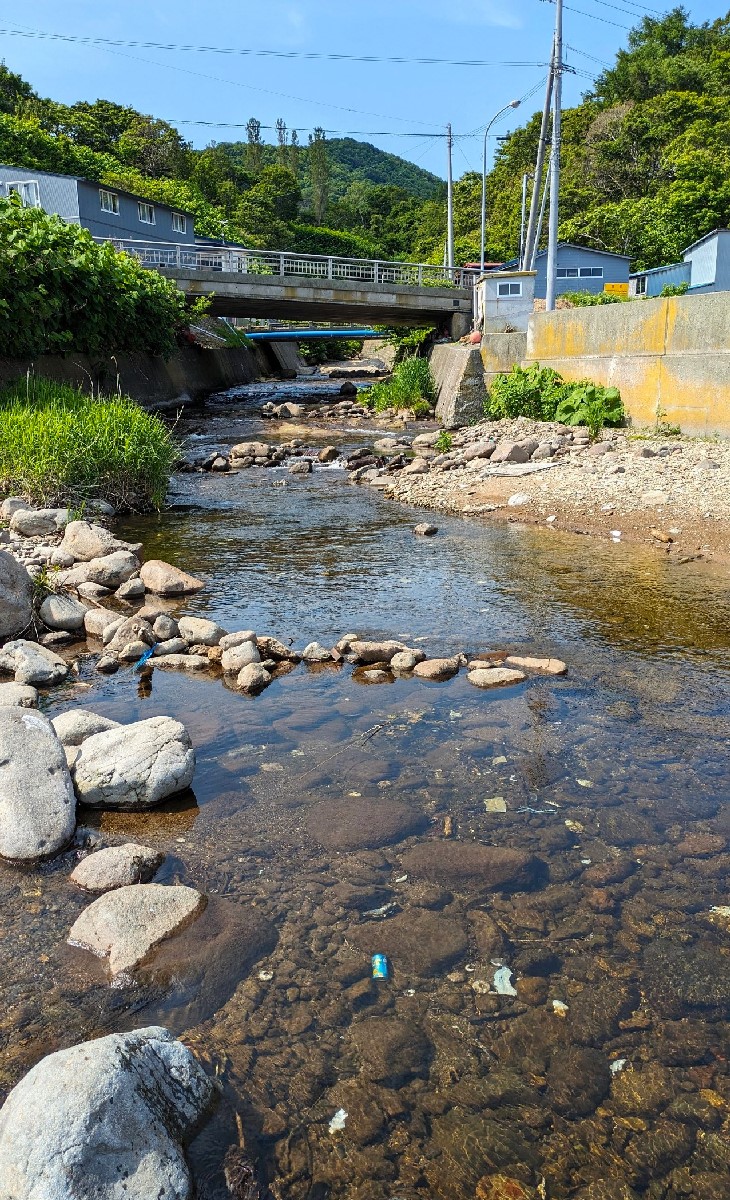 河口周辺は岩盤の川底で浅いものの、少し遡行すると意外に渓流の雰囲気があります。しかし小さなウグイが群れているだけで渓流魚は釣れません。