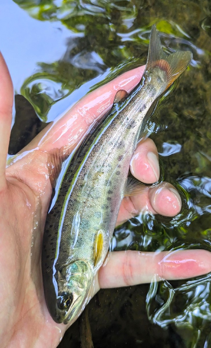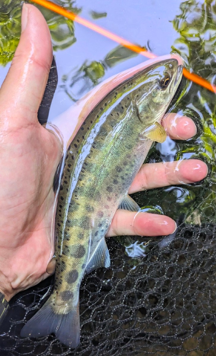 ここで小さなヤマメがヒット。やはり釣れてくれましたが、釣り人が入らない割に魚影は薄い印象です。