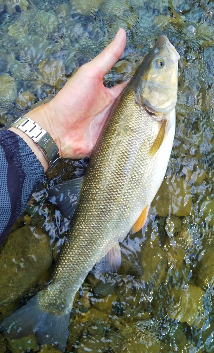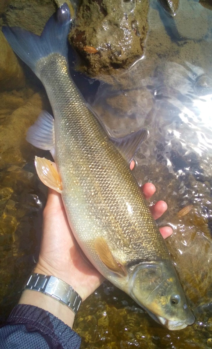 釣れたのは44センチの極太ウグイでした。自己記録に迫るサイズの大物です。ダム上流でもウグイの魚影は健在ですね。