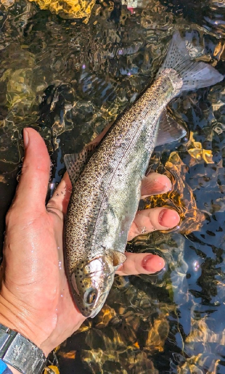 19センチのニジマスがヒット。程良く魚影はありますが、なかなか思ったような良型が釣れません。