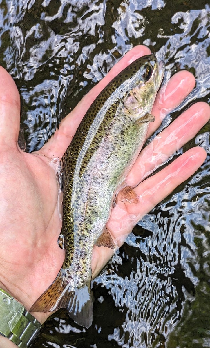 22センチのニジマスがヒット。落合ダム下流の小樽川ではニジマス以外釣れた事がありません。ヤマメとイワナの魚影が濃い余市川水系では珍しい印象です。