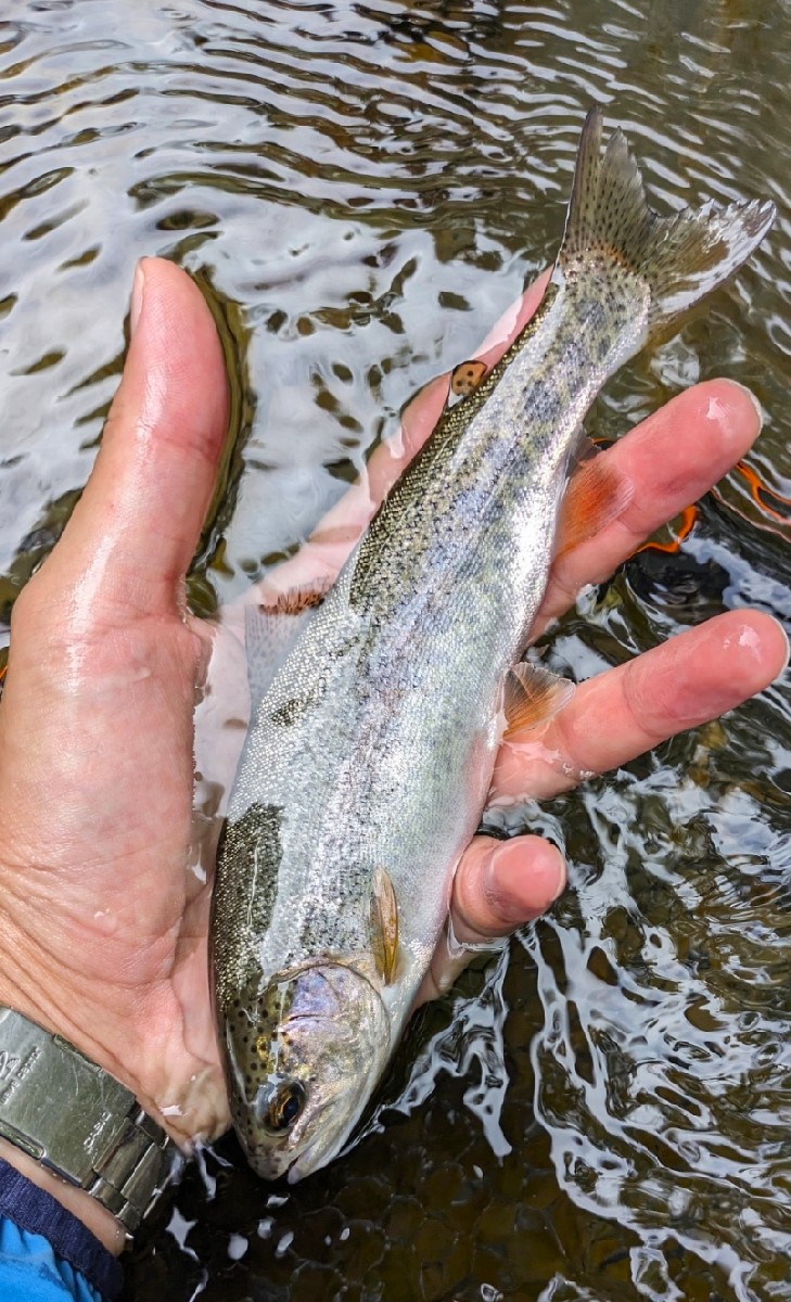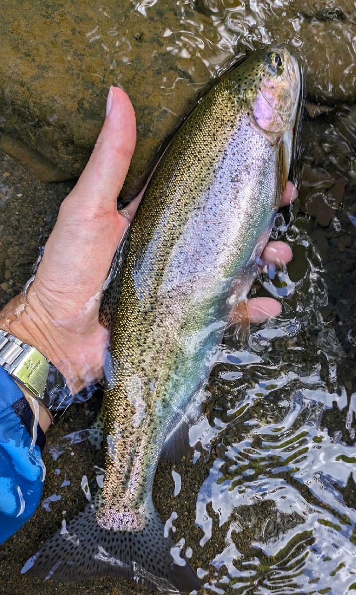やはりニジマスが生息しています。しかし目立つポイントのため魚は既にスレ気味で、何度かアタリがありましたが釣れたのは1匹だけでした。