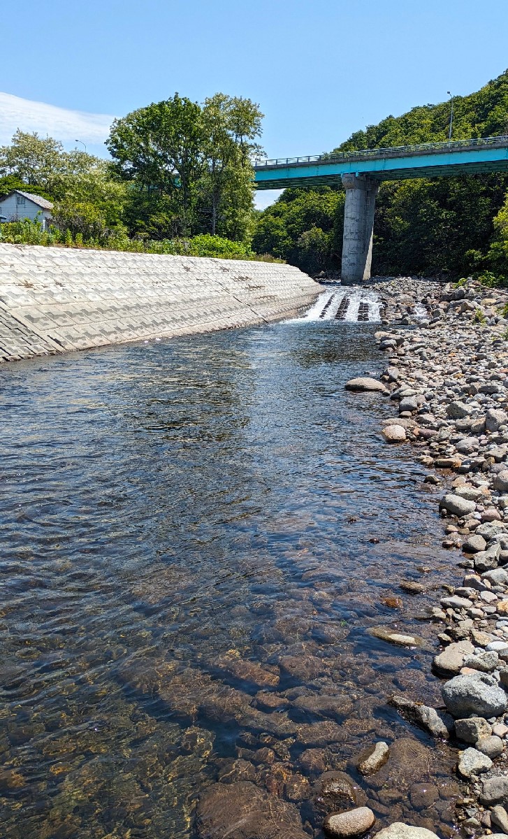 まずは人工物が絡む大きな深場に到着。目立つポイントで入渓も楽なのでノーヒットかと思いきや、予想外に激しいアタリがありました。これは時期的にも場所的にもサクラマスを釣ってしまったかと思いきや、