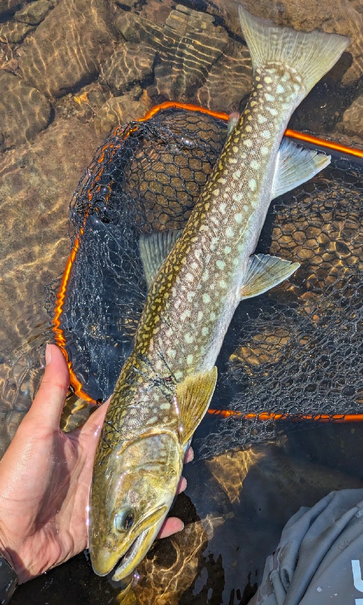 上がってきたのは50オーバーの巨大アメマスでした。こんな大物が幌川に潜んでいた事がビックリですし、隣の群別川で果たせなかった50オーバーの目標も無事達成。正確なサイズを計測すると52センチでした。