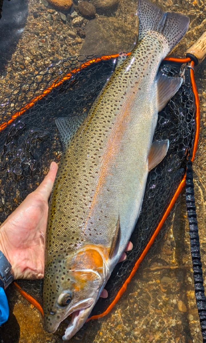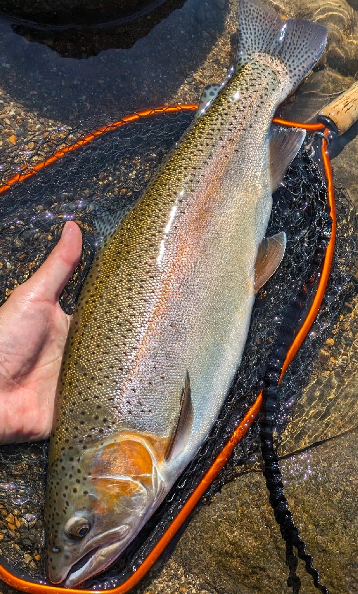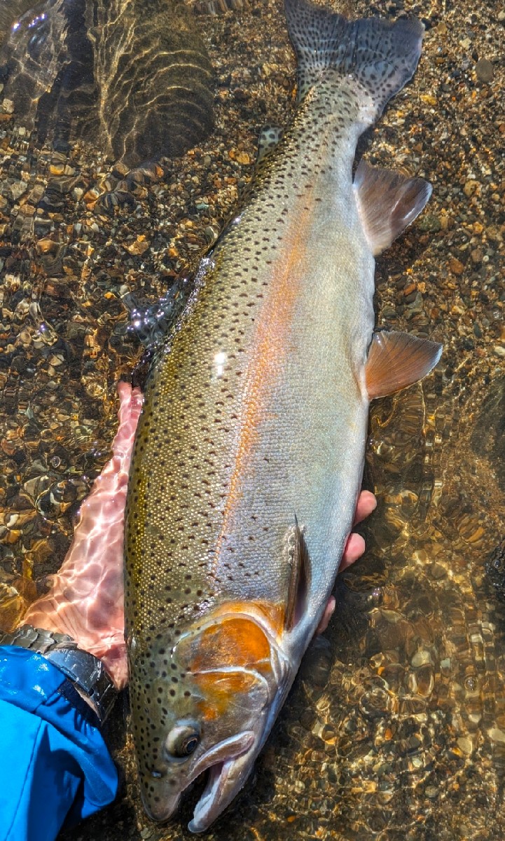 川岸の深場は続いているので、先程のヤマメ以上の釣果を狙って釣り下っていきます。すると10メートルほど下流で、ヤマメとは桁違いの猛烈なアタリが。予想外の大物が掛かりドラグを調整しながらサクラマスの可能性も考えましたが、それにしては引きが強過ぎます。数分間慎重にファイトして、ようやく浮かび上がってきた魚体は