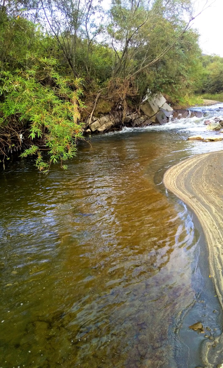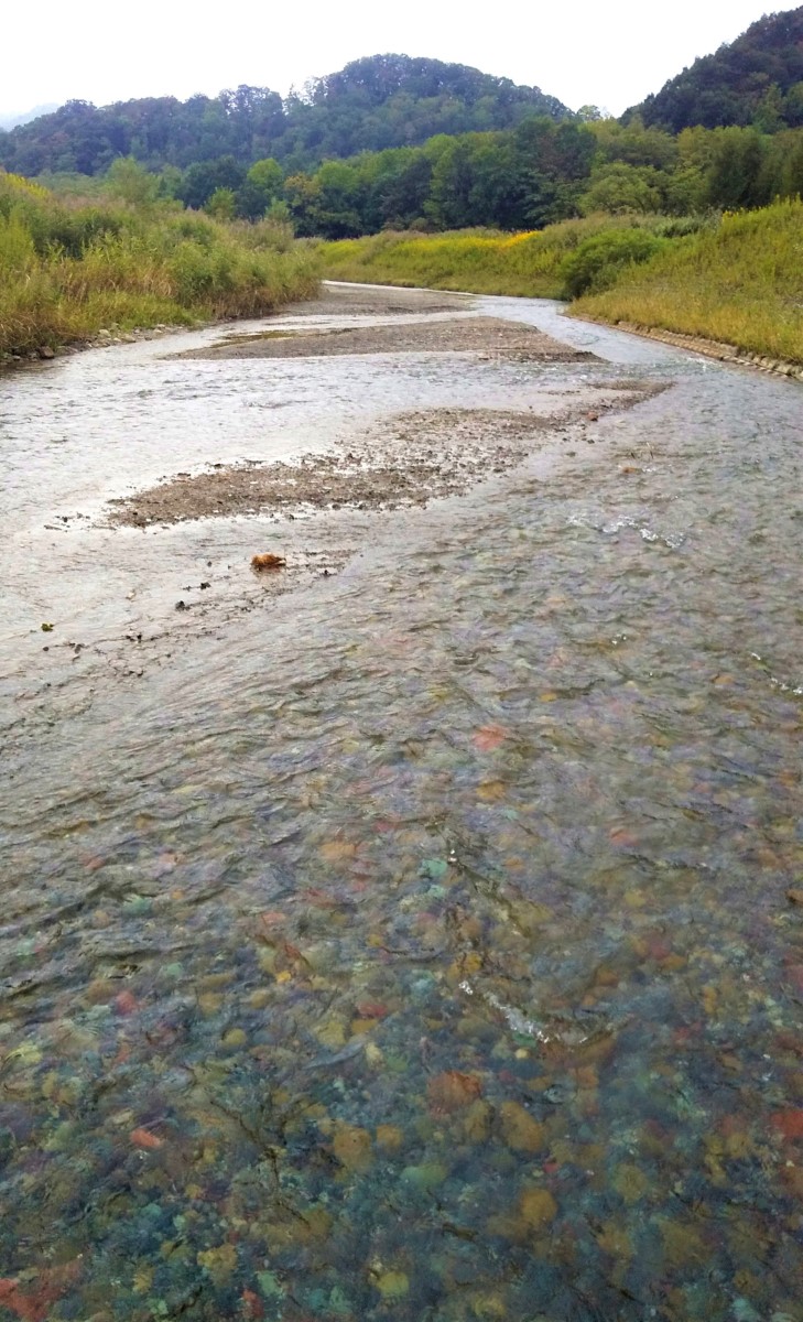 その後ご覧の中流域で竿を振るも、白く濁っていて生命反応が全くありません。