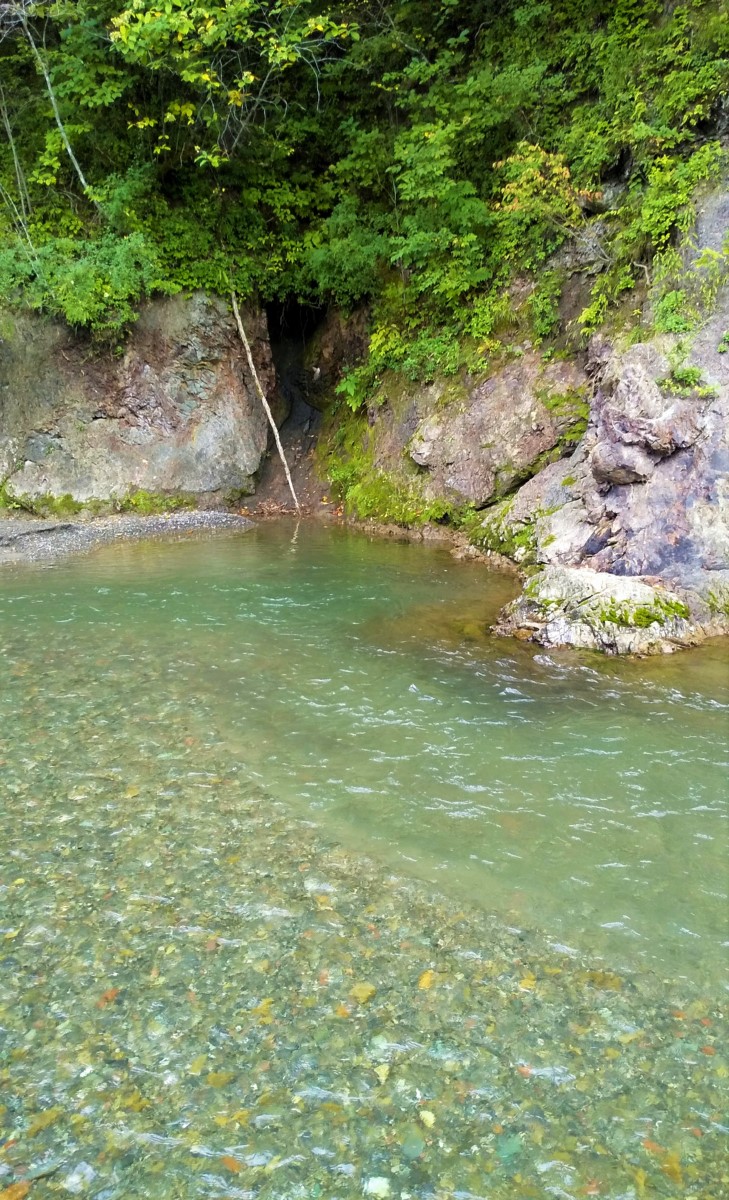 それでも歩いていくと絶好の深場を発見。渓流魚が生息している川なら間違いなく釣れるポイントですが、