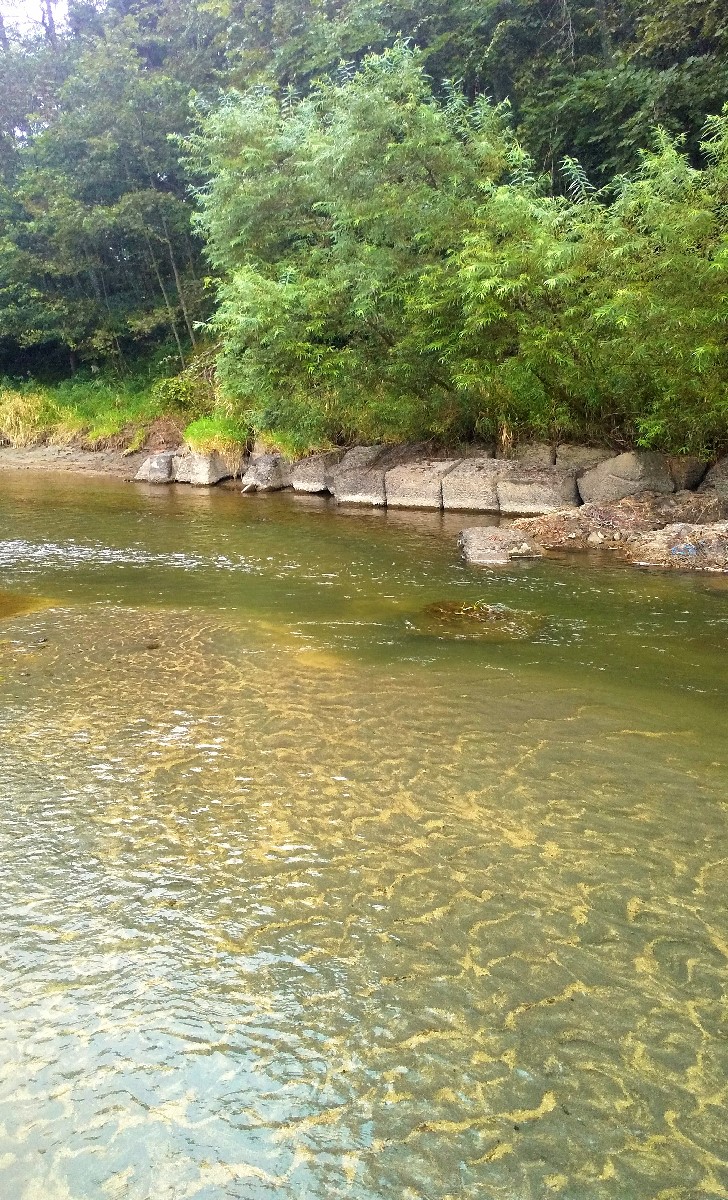 最近雨が降っていないのでクリアな水質ですが、川底の砂が細かく濁りやすい川ですね。するとここで岩盤に小さな流れ込みが絡むポイントを発見。仕掛けを投入すると