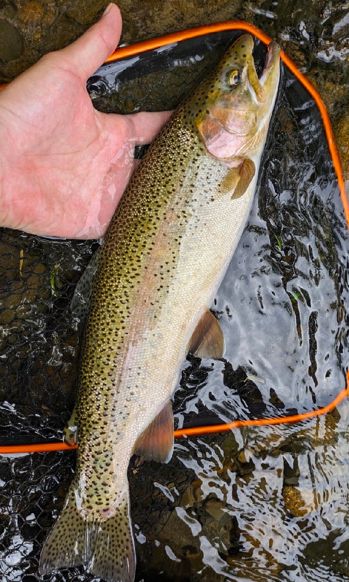 なんと40センチの良型ニジマスでした。太さも顔付きも見事な魚体ですね。坊主を覚悟していた中での思わぬ釣果に驚きを隠せません。