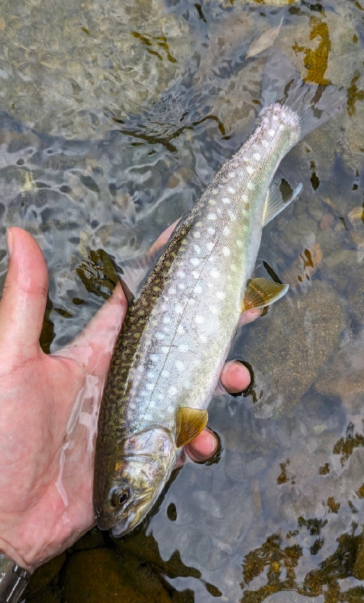 26センチの太ったイワナがヒット。やはり先程のニジマスは奇跡的で、それほど大物が潜んでいないようなので、今日はここで帰宅しました。早雲内滝まで魚類の遡上を妨げる人工物は見当たらないため、本流から大物が遡上する可能性もゼロではありませんが、それを考慮しても先程のニジマスは相当な幸運でしょう。また機会があれば秋頃水量が多い時期に訪れてみようと思います。魚は全てリリースしました。