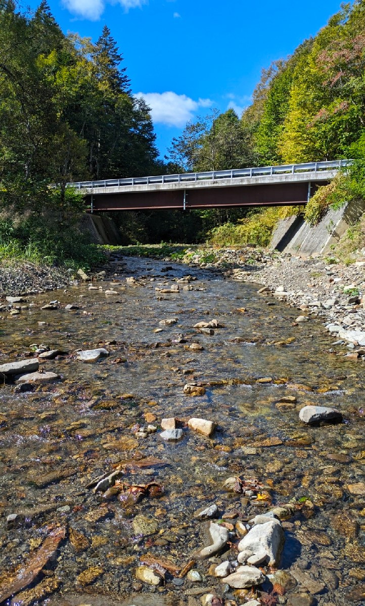 無事芦別川本流まで戻ってきました。秋の芦別川は増水気味の事が多いですが、今日は程良い水量で濁りもないので少し竿を振ってみましょう。とは言え人気河川の目立つ深場で簡単には釣れないだろうと思いきや、