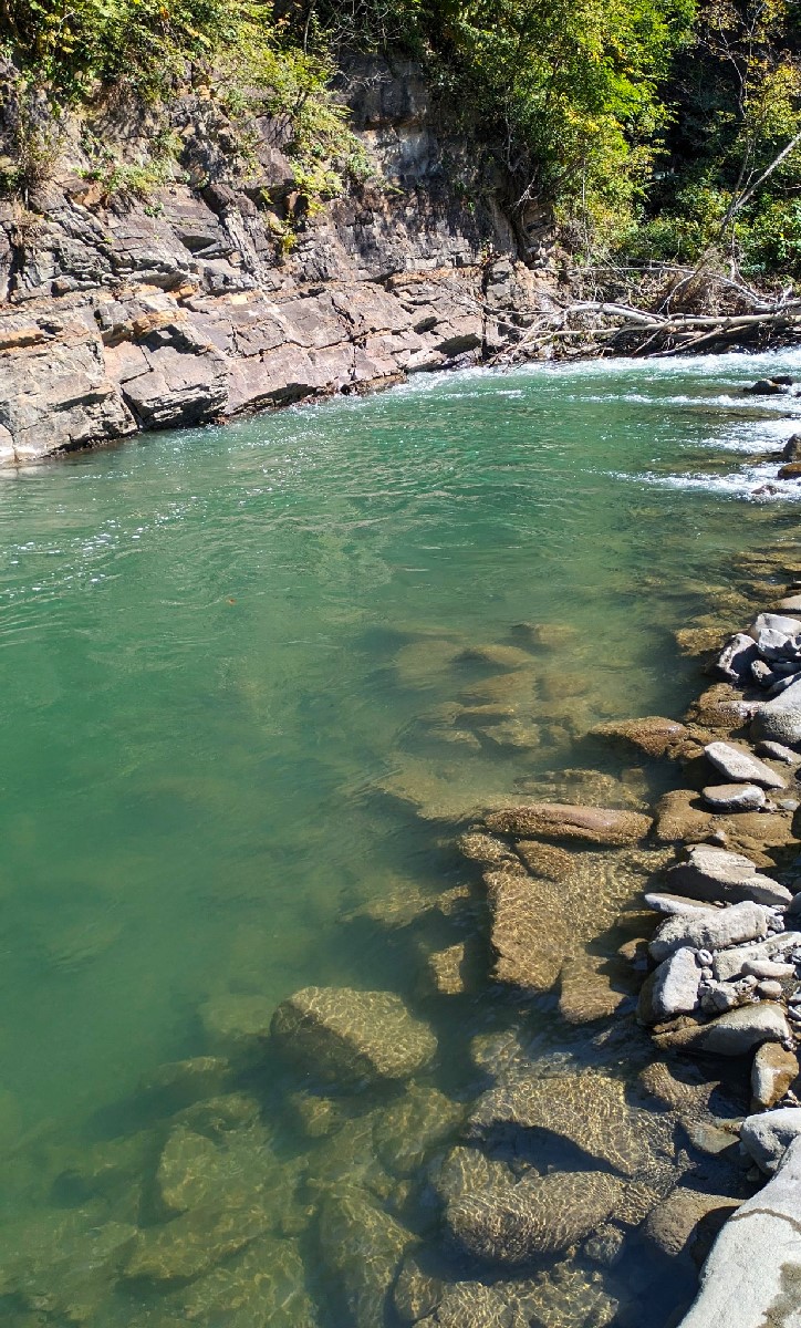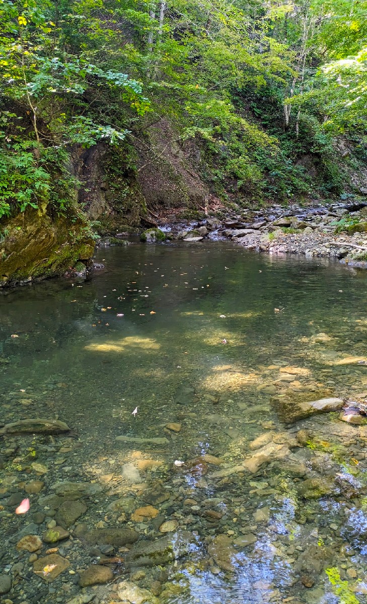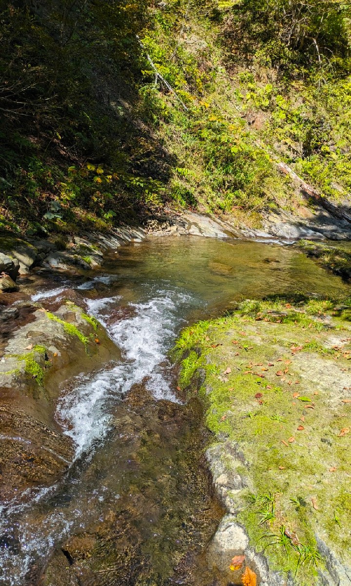 その後もアタリがないまま月見沢の滝まで残り半分の地点まで遡行すると、6年前に良型ニジマスがチェイスしてきた深場を発見。ここで待望のアタリがあり