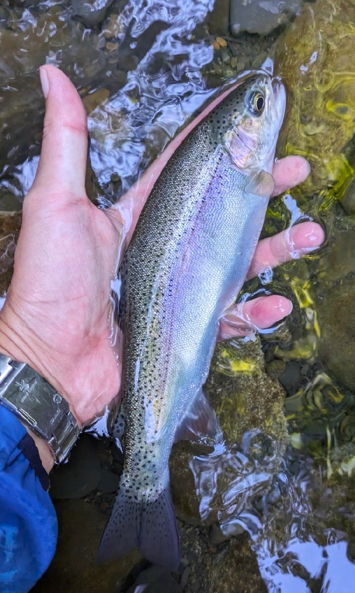 小さなニジマスがヒット。人的プレッシャーの影響も多少あるかもしれませんが、元々良型を狙うのは難しい印象です。薄暗い渓流は大物が育ちにくい気がします。