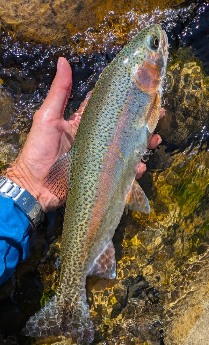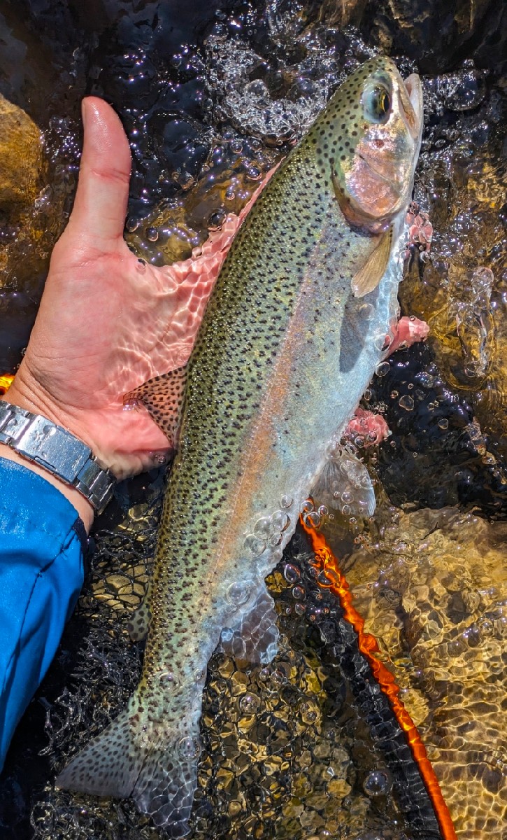 34センチのニジマスがヒット。やっと良型が出てくれました。日当たりの良い場所のニジマスは魚体も美しい気がします。