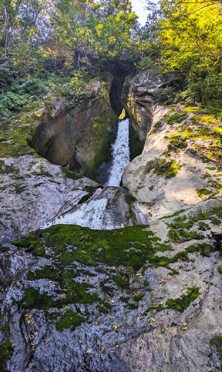 手前の岩が滑らかで登れないので滝壺は見えませんが、間近で見ると結構大きな滝で迫力満点です。鍵穴のような不思議な造形でファンタジー世界に迷い込んだようですね。