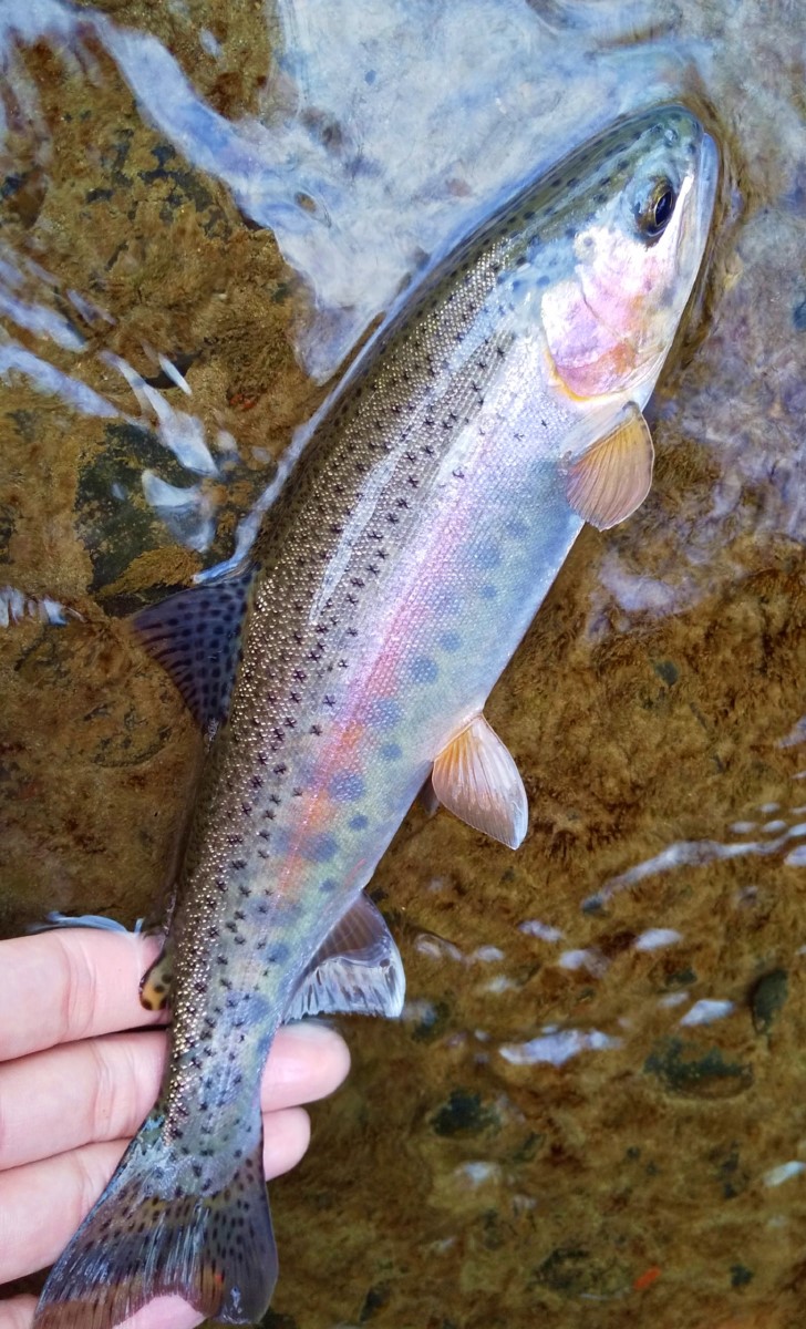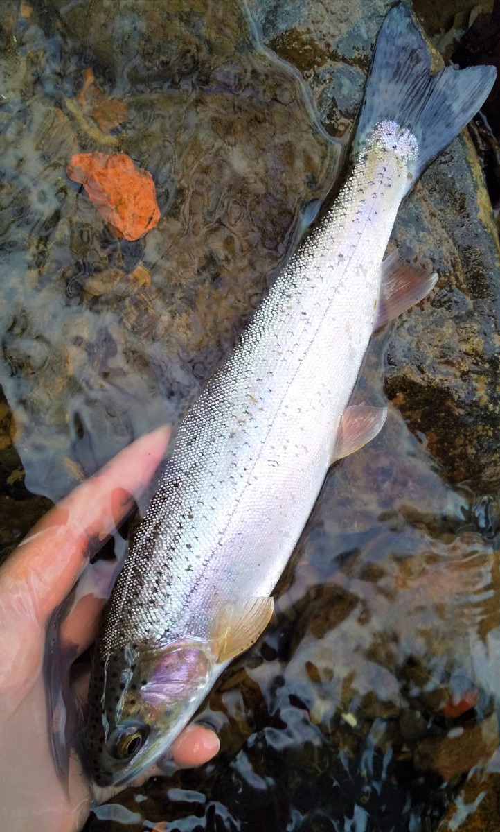 今回は28センチのニジマスがヒット。その後も続けてアタリがあり、25センチ前後のニジマスが数匹釣れました。周辺の空知川支流で散見されるヤマメやイワナの姿はありませんね。