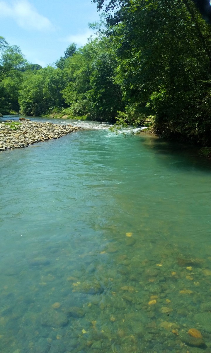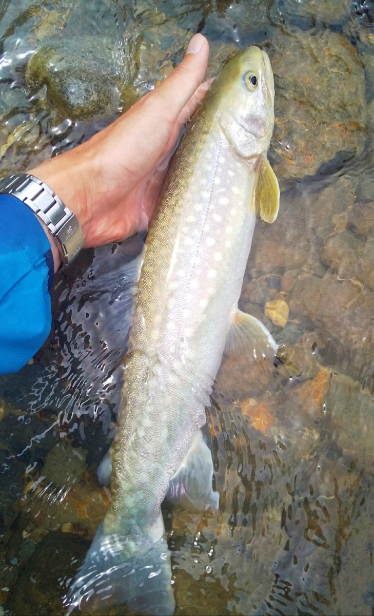 しかし魚影が薄い分、掛かれば大物が多いはずと信じて写真の深場を攻めると、瞬時にヤマメではないと分かる猛烈なアタリが。銀色の魚体が見えたので、これはサクラマスを釣ってしまったかと思いきや