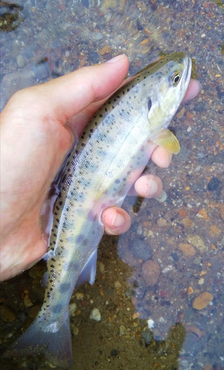最後に最上流域のカルルス温泉から入渓するも川底が温泉の影響で白く、魚類は生息していない様子だったので今日はここで帰宅しました。こうなると取水施設直下までは魚影があると思われますが、その上流にイワナが生息しているかは微妙ですね。取水施設に続く道は室蘭市水道関係者以外立入禁止なので、到達するには本流を2キロ以上遡行するかクスリサンベツ川を下るしかありません。極めて入渓地点の少ない河川なので夢はありますが、そこまでして調査したいと思わないのが本音ですね。しかし渓流魚の生息は確認できたので、また機会があれば訪れてみようと思います。魚は全てリリースしました。