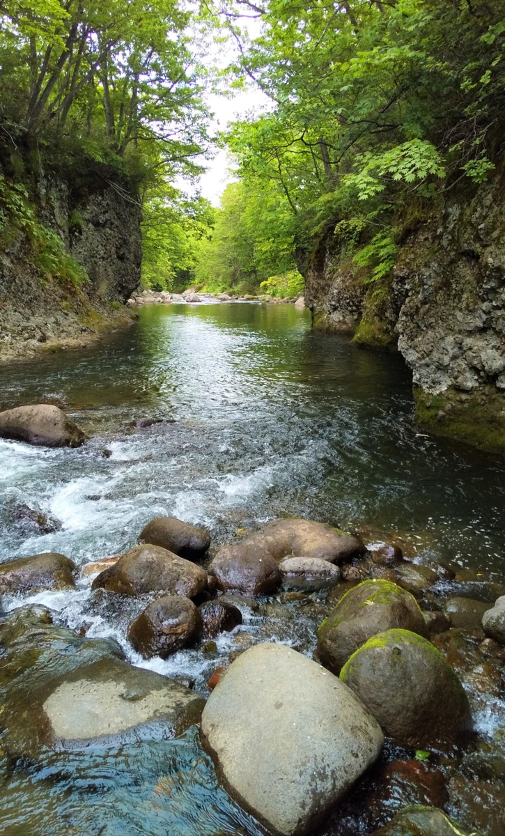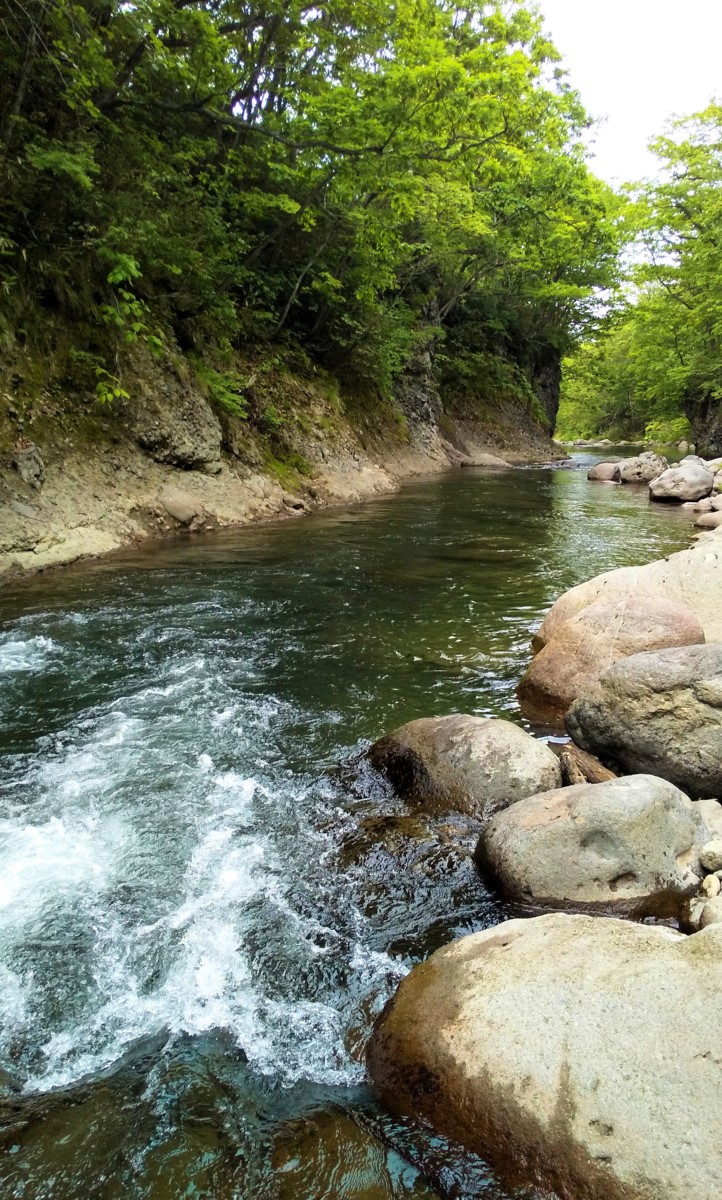 岩がゴロゴロした渓相で歩きにくいものの、積丹半島の河川は清冽で気分が良いですね。これで釣果も上がれば言う事なしですが、何故か全く魚影を確認できません。