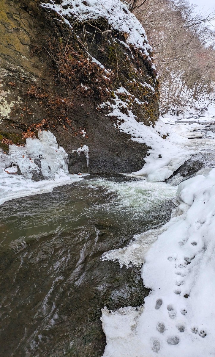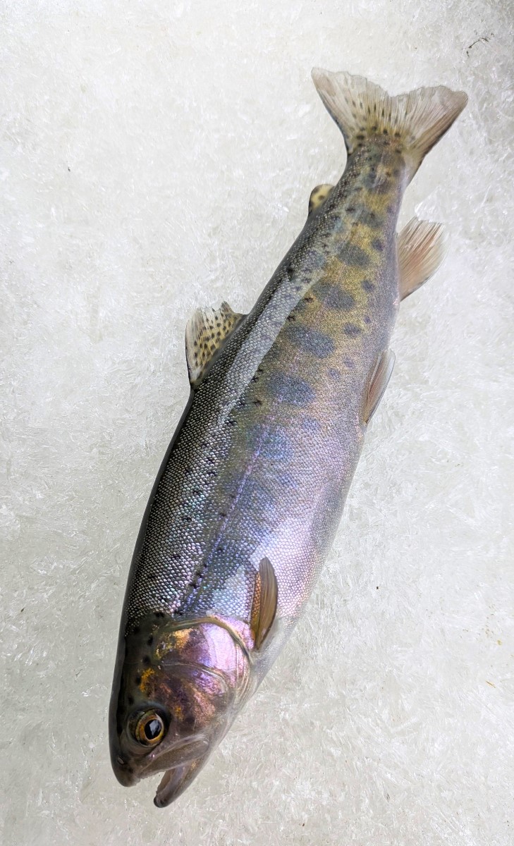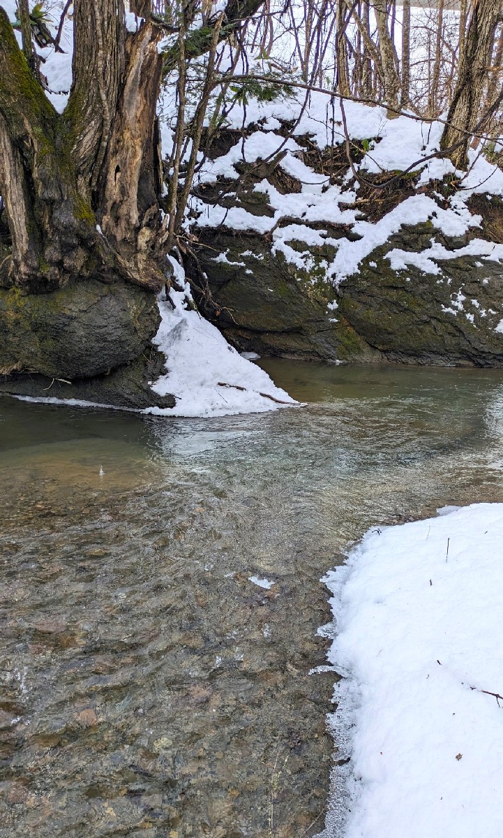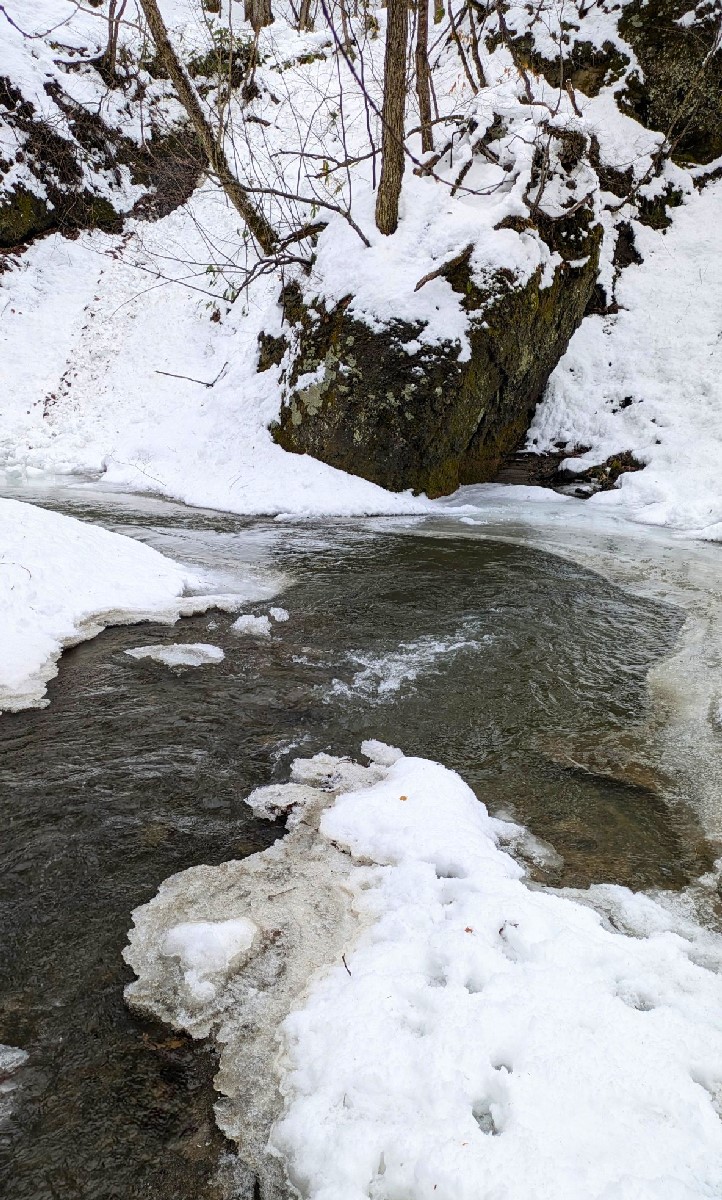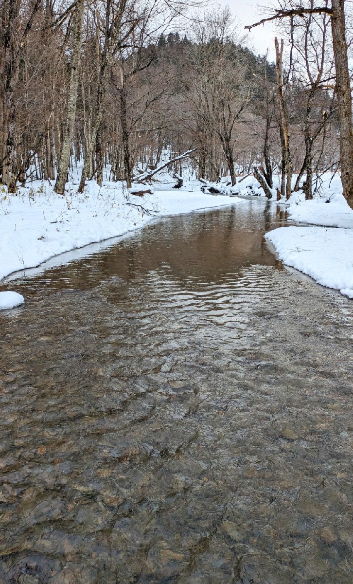 23センチのニジマスがヒット。こうなると源流部まで調査したくなりますが、渓相的に大物狙いは至難と判断して引き返しました。冬でも熊の恐怖を感じるエリアなので仕方ありません。