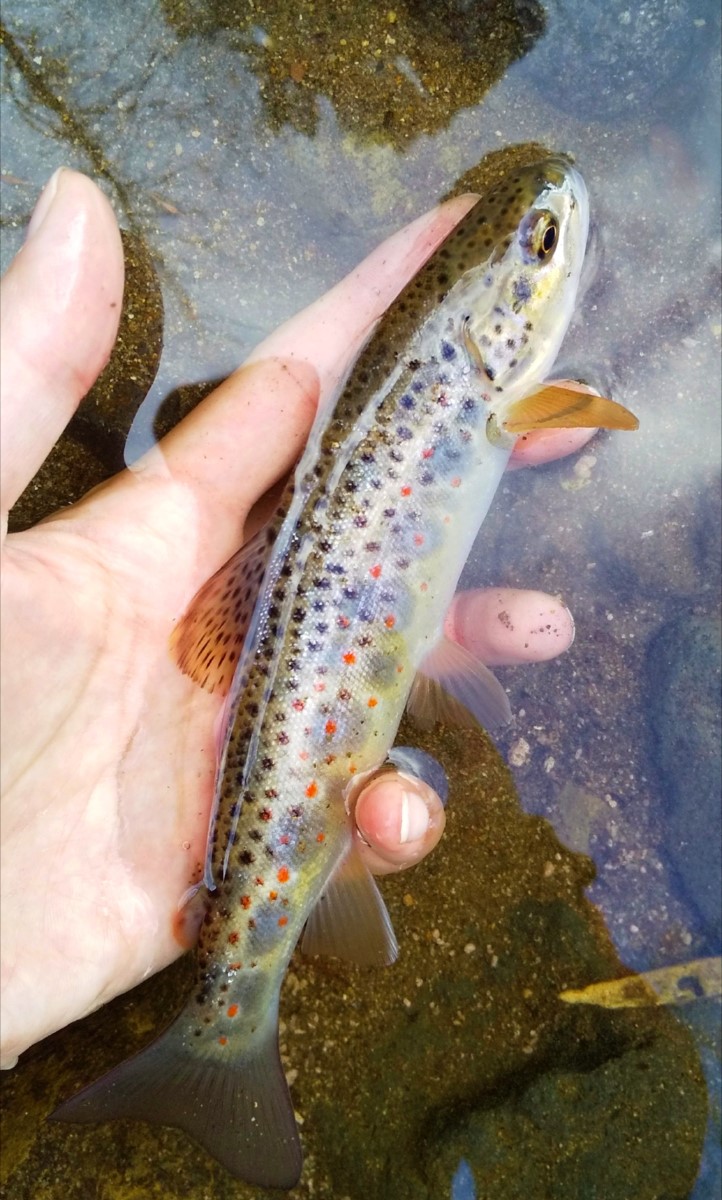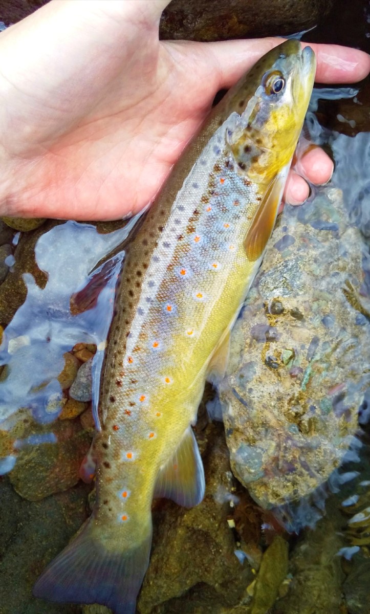 18センチのブラウントラウトがヒット。そこそこ魚影はありますが大物狙いは難しいですね。砂防ダムのせいで調査が早く終わってしまったので、