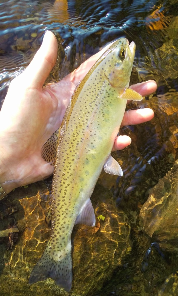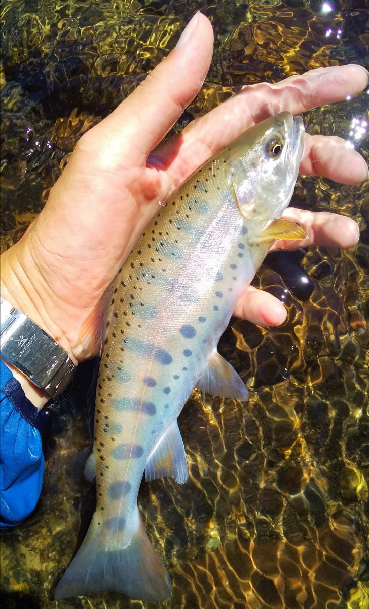 24センチの幅広ヤマメがヒット。朝日に輝くパーマークが実に美しいですね。さらに続けて