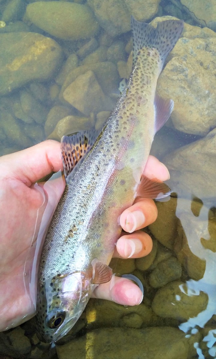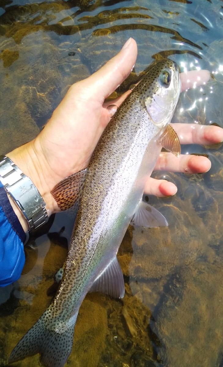 22センチのニジマスがヒット。大物も生息しているはずですが水温が高過ぎるのかもしれません。