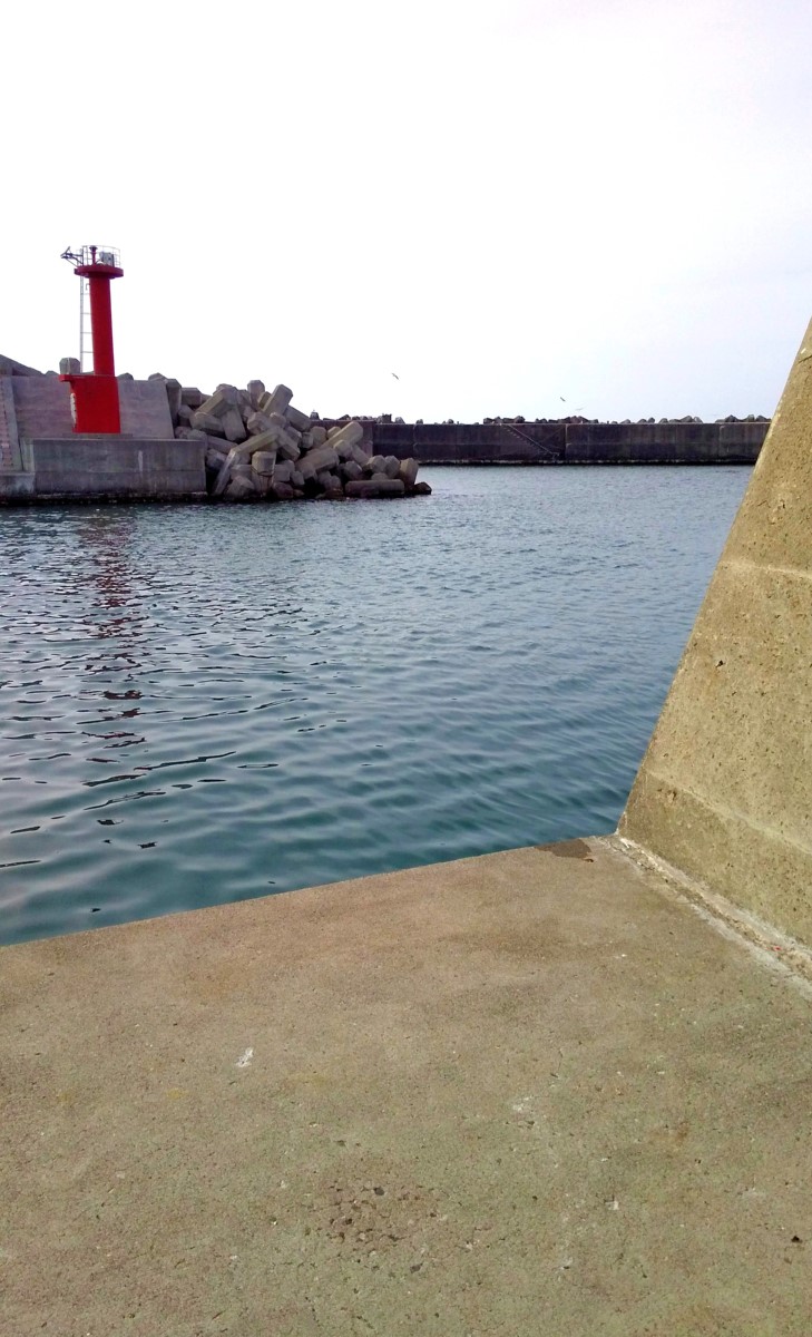 港の先端部から外海を眺めると、どうやら港内の方が水深がありそうなので足元をブラーで探ると
