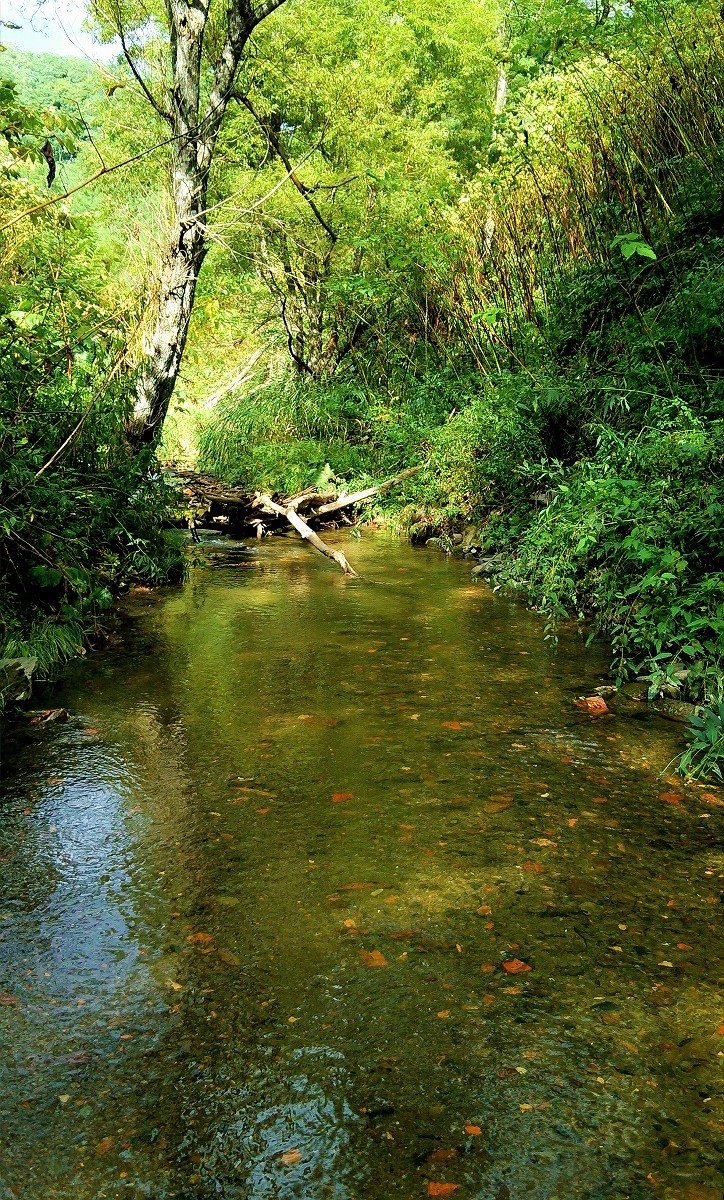美しいヤマメたちに出会い気分良く浅瀬を歩いていきます。するといきなり足元で水飛沫が上がったので、声を出して驚いてしまいました。なんとそこには婚姻色に染まったサクラマスが泳いでいたのです。川でサクラマスを見た事は何度もありますが、こんな山奥の小河川でサクラマスを見た事はありません。その遥かな旅路を思うと畏敬の念が込み上げてきますね。