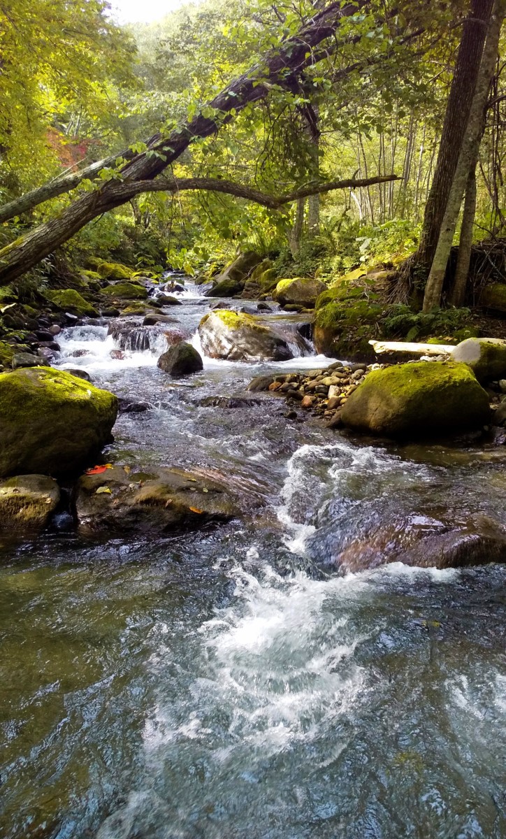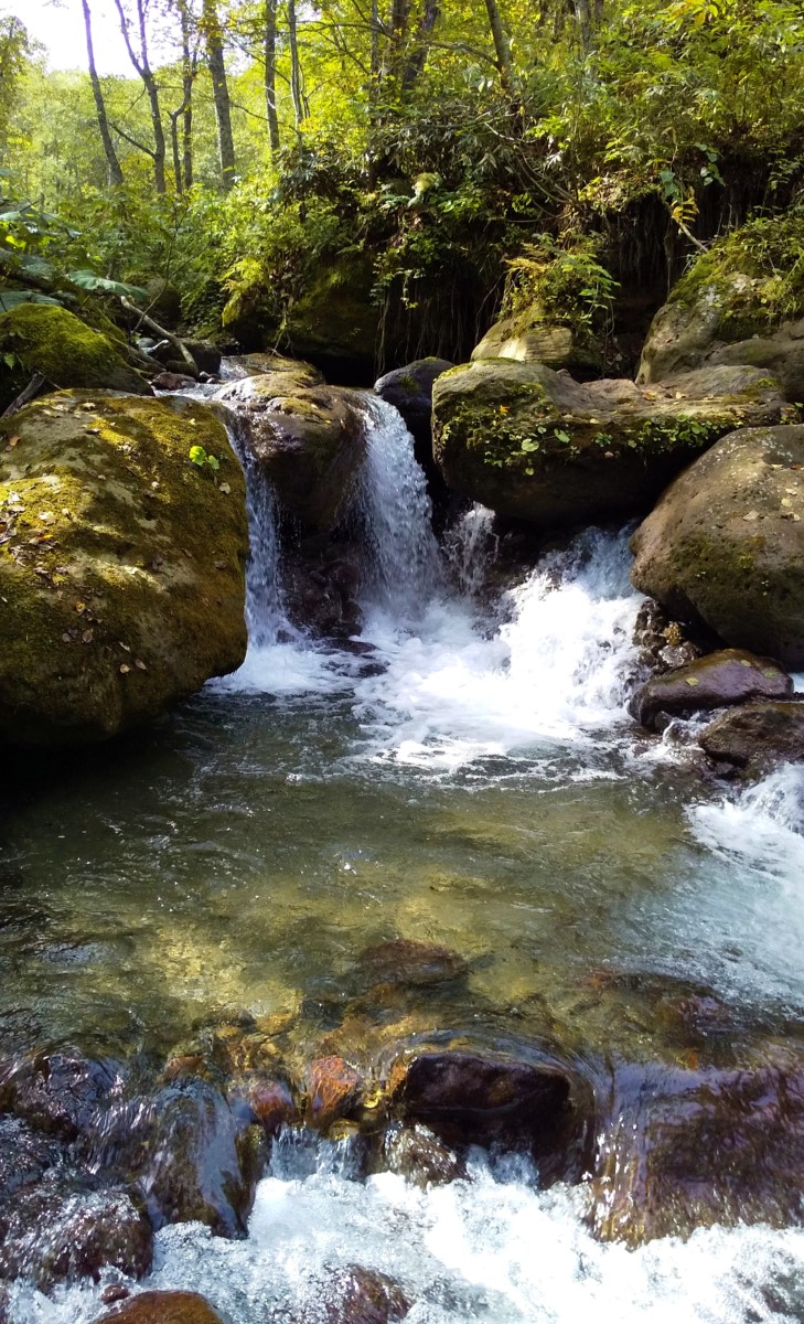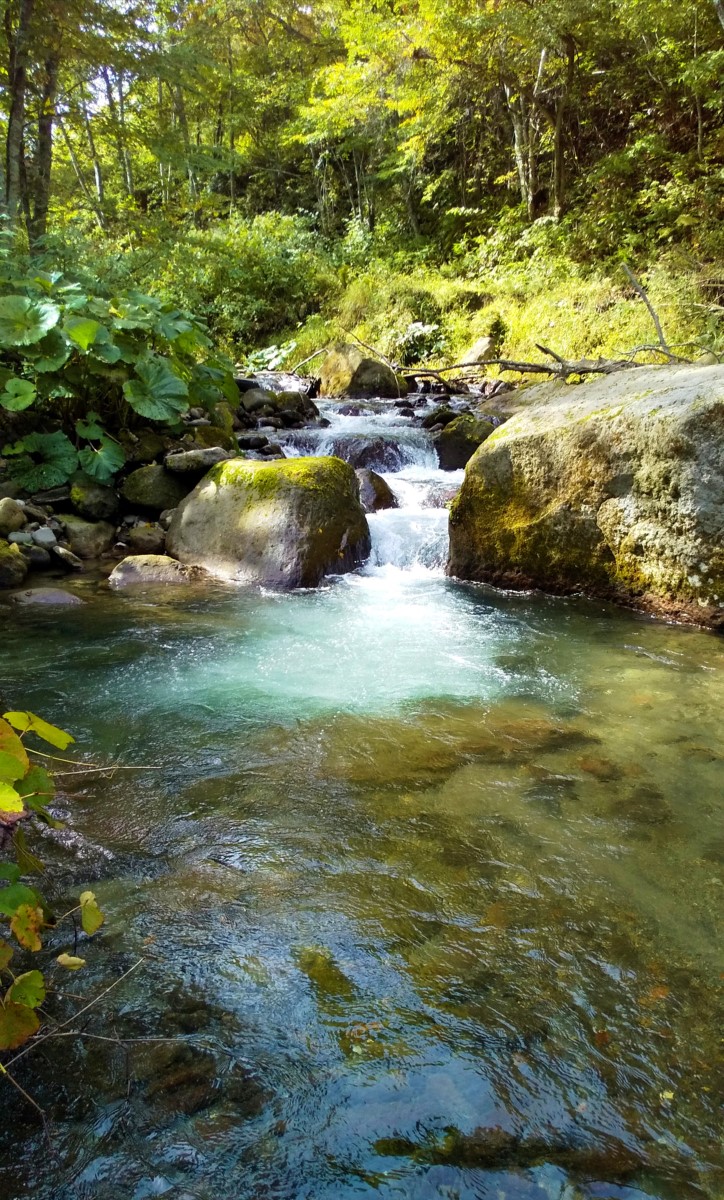 落差のある流れを釣り上がっていくと美しい深場が点在しています。まずは写真のポイントに仕掛けを投入すると
