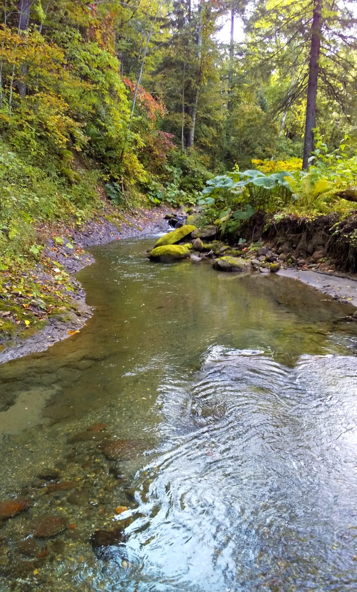 流れの緩いポイントでは20センチ前後の魚影が群れていますね。イワナかオショロコマでしょうか。