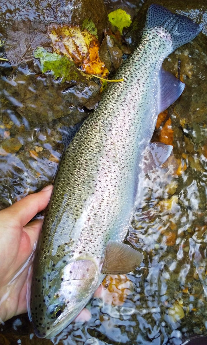 40センチのニジマスがヒット。居心地の良さそうな深場はニジマスの楽園となっているようですね。まさに虹鱒の楽園沢川といった所でしょう。