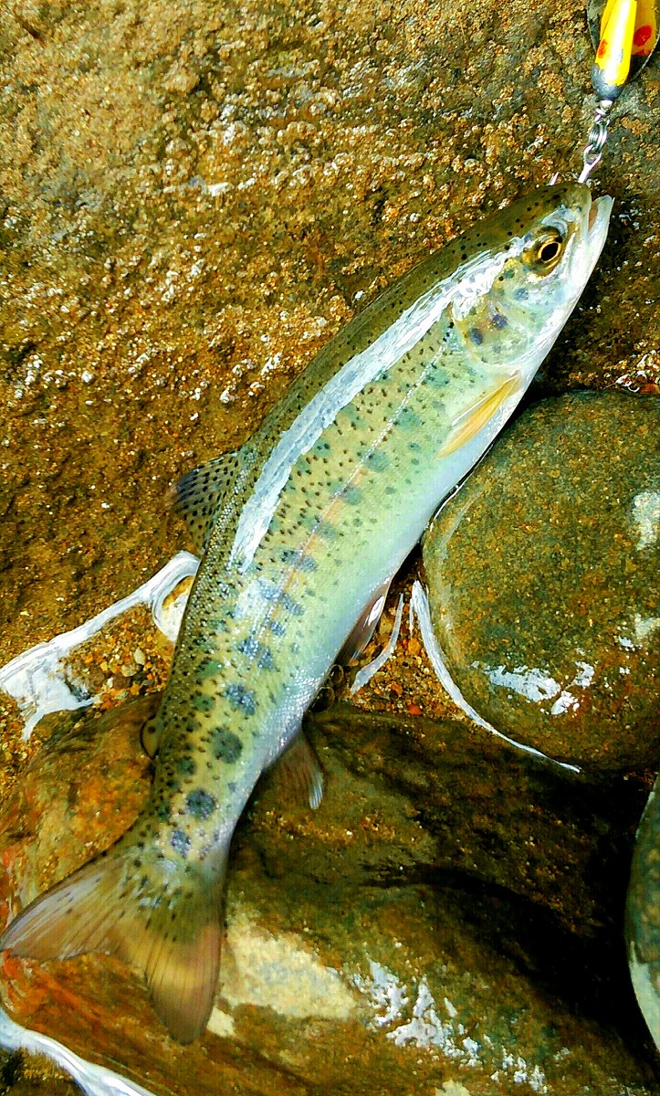 小さなニジマスがヒット。人気河川の巨大魚は賢いので、騙せるのは小さい魚だけですね。