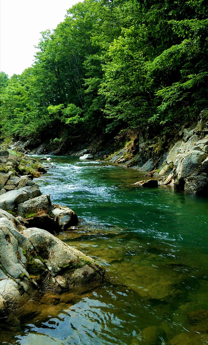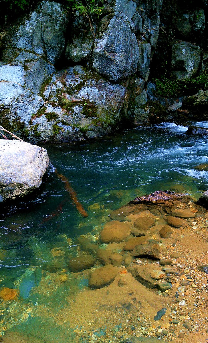 27センチのニジマスがヒット。やっとまともなサイズの渓流魚が釣れました。綺麗な浅瀬で写真を撮りたかったのですが、この渓相では無理ですね。
