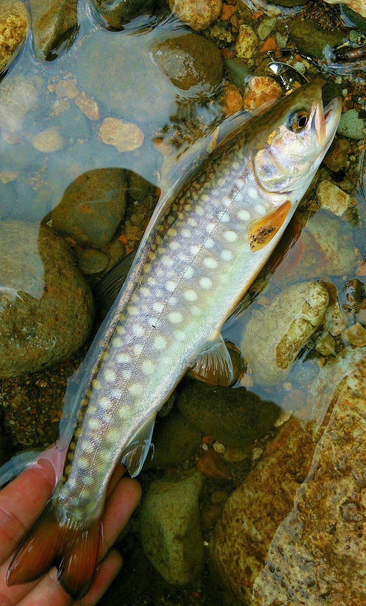 24センチのイワナがヒット。ここまで上流に来ると豊平川本流でもイワナの魚影が濃くなりますね。さらに岩陰から水中を覗いてみると、40センチ近い魚が底に張り付いていましたが反応してくれません。