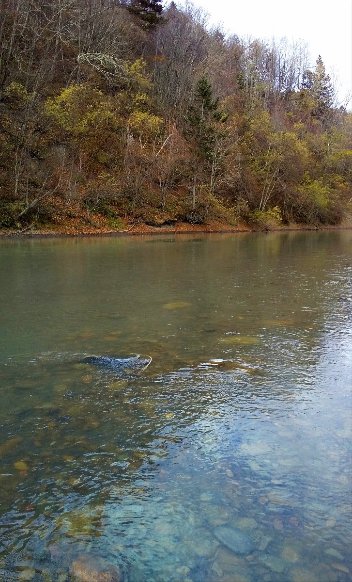 40センチのニジマスがヒット。今まで沙流川本流では最高でも30センチ程度のニジマスしか釣った事がなかったので嬉しいですね。