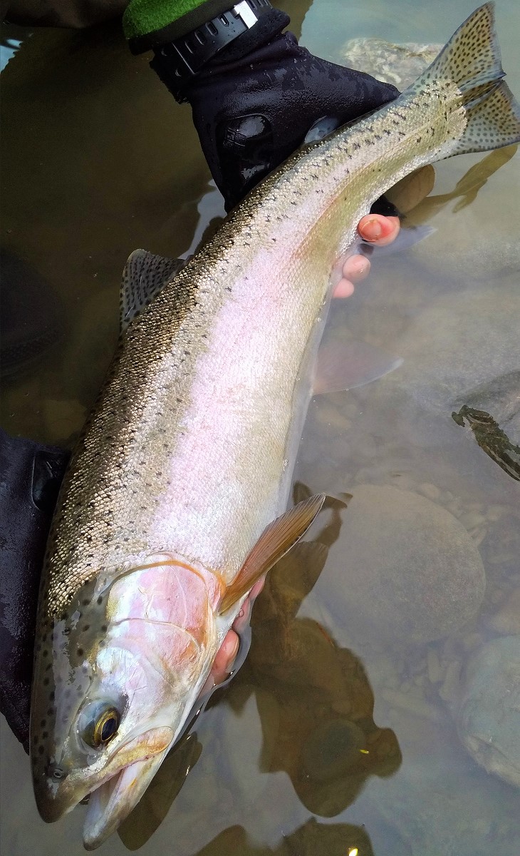その後は大した釣果もなく釣り上がっていくと、再び大きな深場を発見。ここで良型ニジマスがヒットするも、豪快なジャンプで針を外されてしまいました。