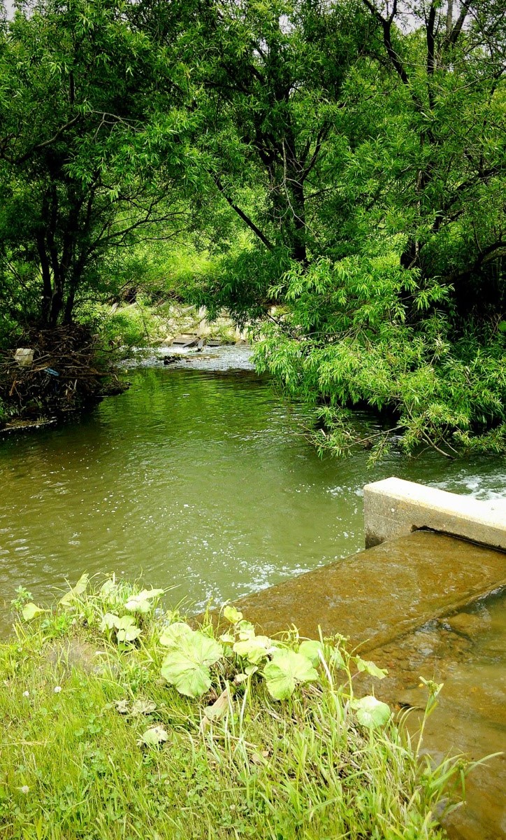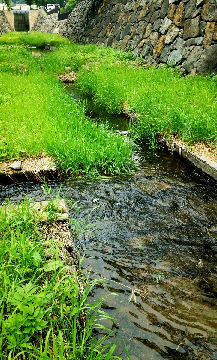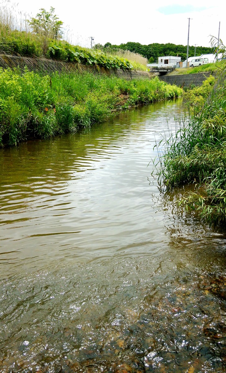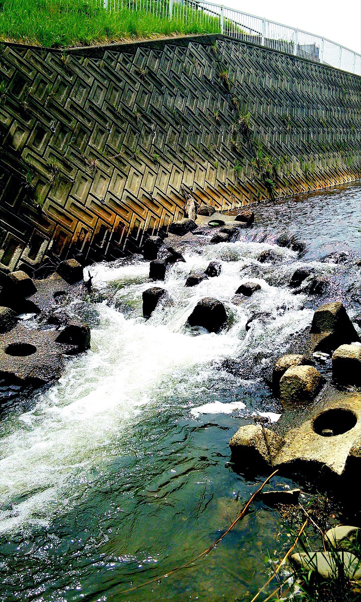 上流は人工の滝と急流が延々と続いています。しかしいくら釣り上がってもアタリが全くないので、もう釣りと言うより沢登りです。しかも川底はヌメヌメして滑りやすく、護岸も高いので川から出る事ができません。これほど遡行が辛い川は初めてです。それでも滝をよじ登っていくと、