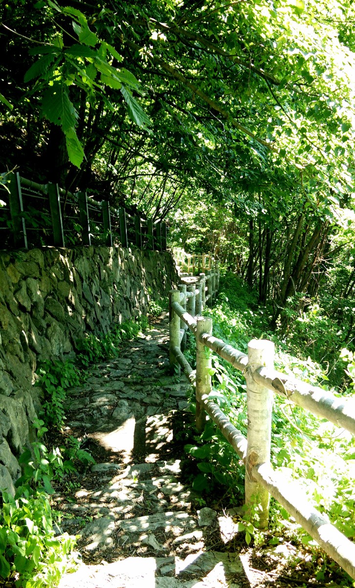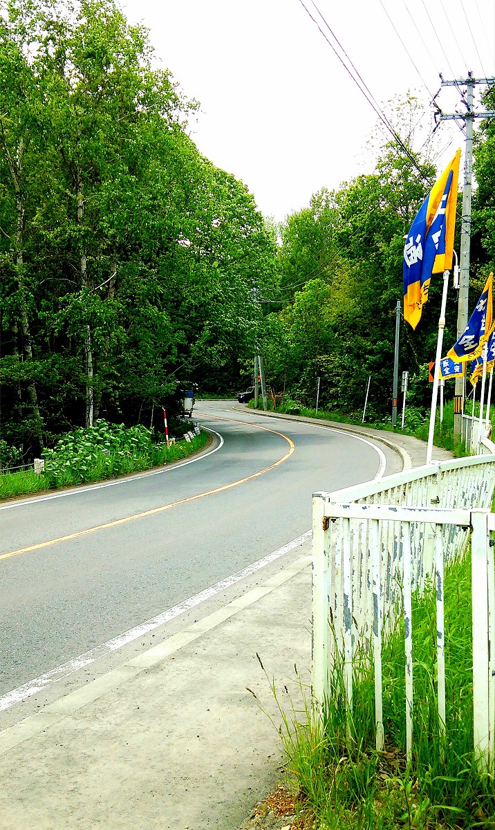釣りができる場所を探して川沿いの道を歩きます。川も急なら道も急です。それでも進んでいくと、