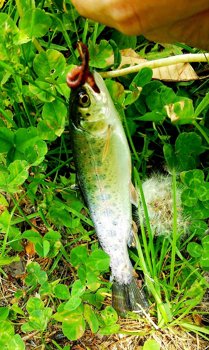 19センチの鮮やかなニジマスがヒット。周りは住宅街なので釣り切られていそうですが、スレてはいるものの魚がいました。ここから上流に釣り上がってみましょう。
