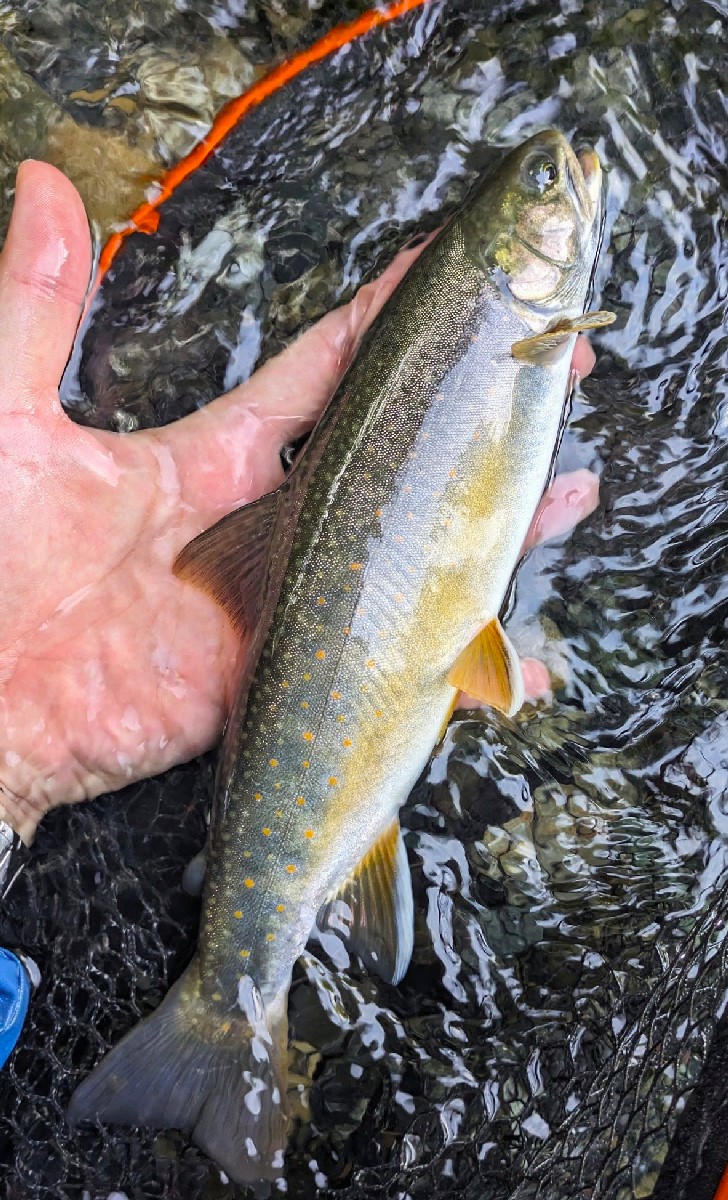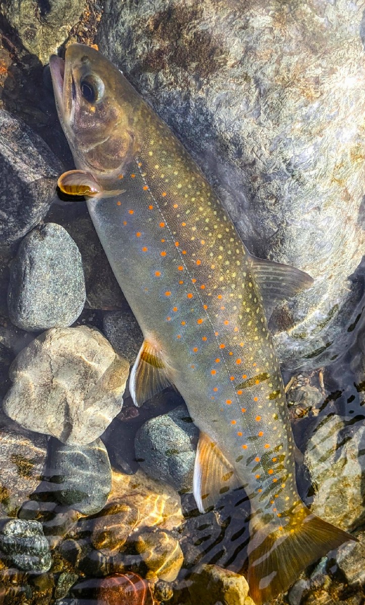 37センチのイワナがヒット。精悍な面構えといい、アイシャドウを塗ったような目の緑色といい、ここ数年見たイワナの中で一番美しいですね。しかも過去にワッカタサップ川で釣れた魚では最大サイズです。
